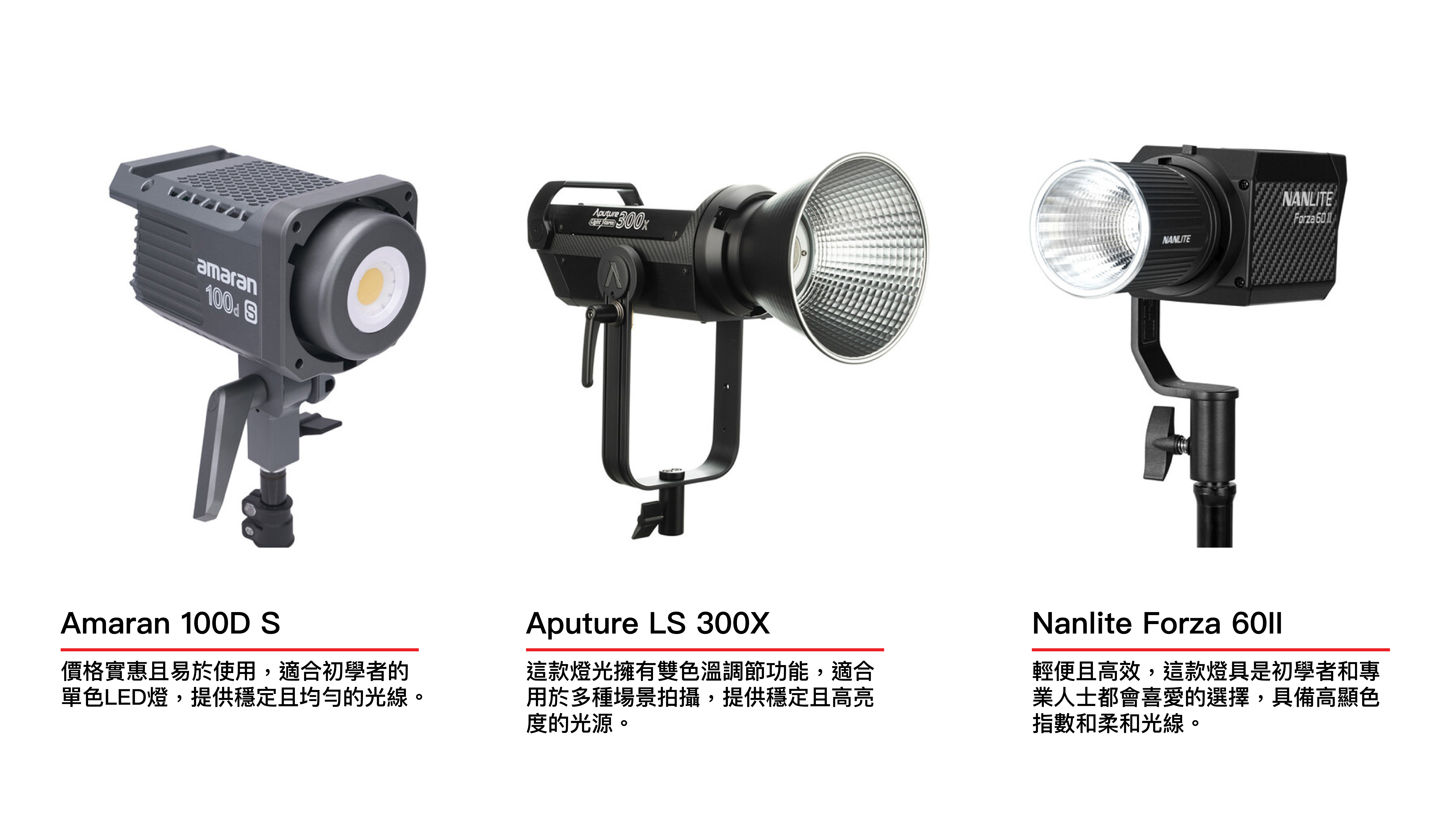 - Aputure LS 300X:這款燈光擁有雙色溫調節功能,適合用於多種場景拍攝,提供穩定且高亮度的光源。