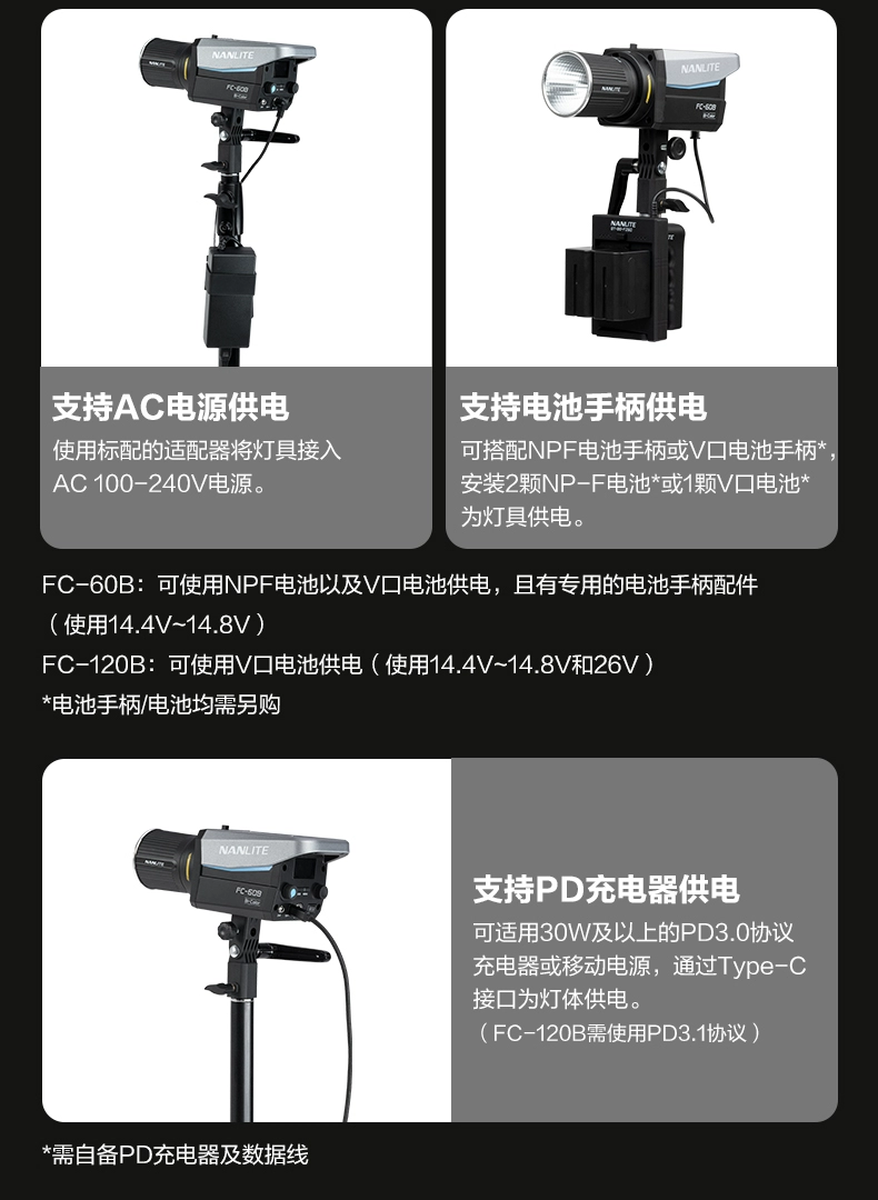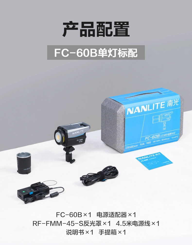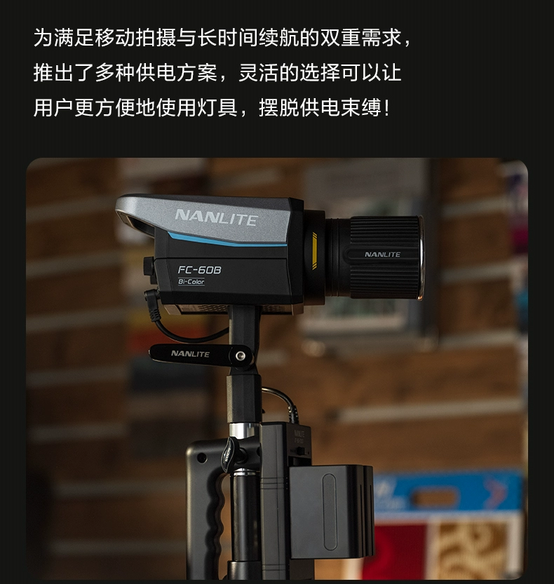 Nanlite FC60B Bi-Color LED Spotlight 是一款專為內容創作者和影片製作者設計的燈具,結合了專業級的功能和經濟實惠的價格。此款60W燈具是 FC 系列中最小巧的燈具,具有可調光與可調色溫範圍(2700K 至 6500K),無論是室內拍攝還是戶外拍攝,都能提供穩定的光源。此燈具除了支持 AC 電源外,還可使用 NP-F 電池或 V-mount 電池,無論在拍攝現場還是外景場地,都能提供穩定的電力支持。