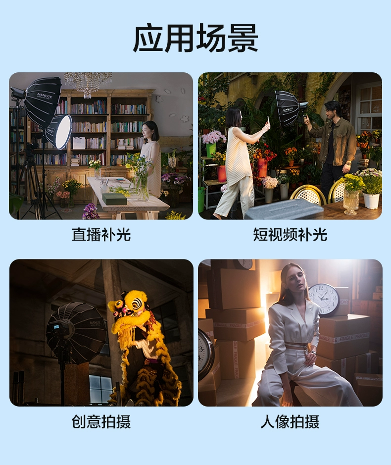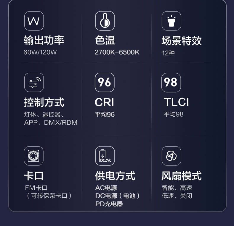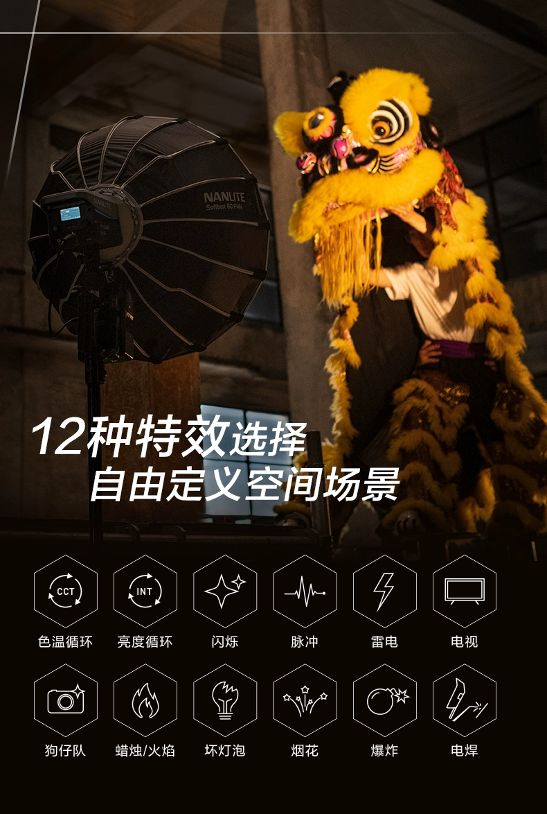 此外,FC60B 擁有高達96的 CRI 值,保證色彩還原精確,並支持 12 種實用的燈光效果,如閃爍、雷暴、蠟燭等,適用於各類影片拍攝需求。這款燈具不僅適合小型拍攝空間,還能輕鬆攜帶,適用於各種移動拍攝環境。