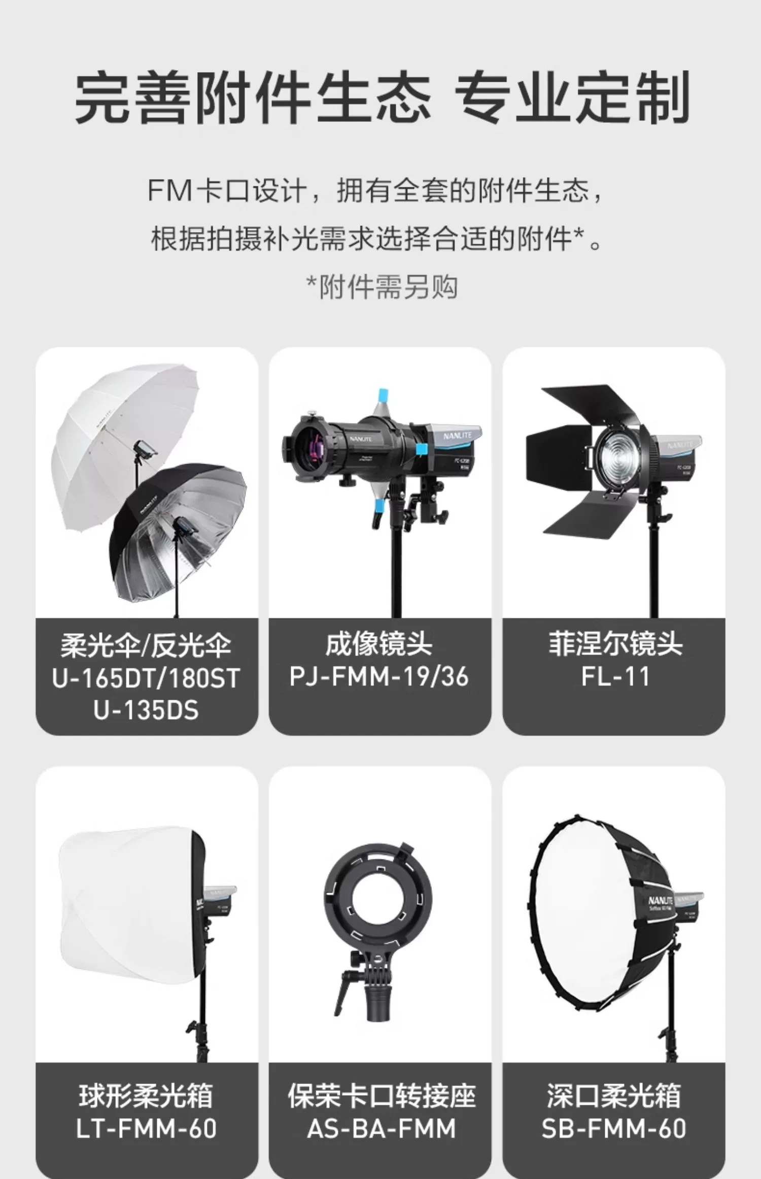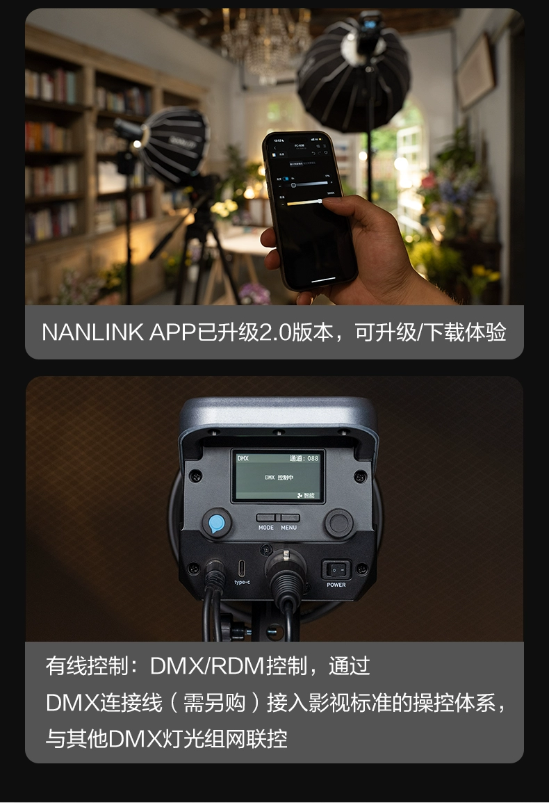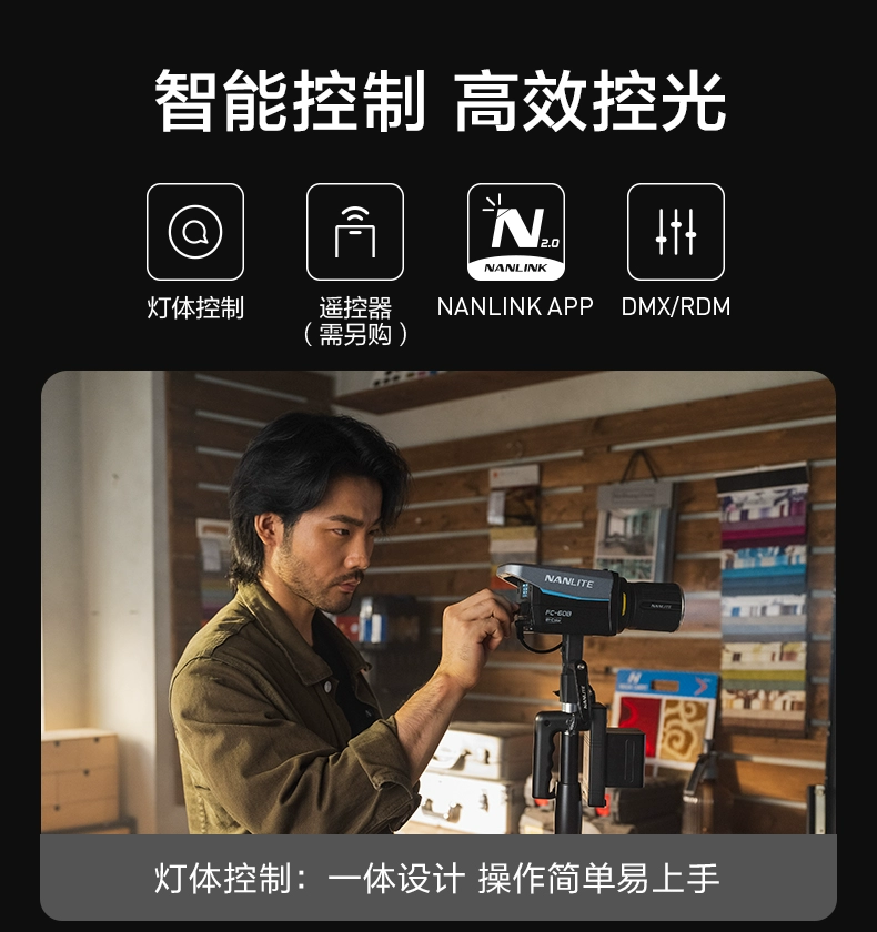 FC60B 配備了 1.4 英寸螢幕的內建控制介面,並且支持透過 NANLINK 應用程式進行藍牙控制,還可選擇使用 WS-TB-1 傳輸器或 WS-RC-C2 遙控器進行遠程控制,適合各種規模的拍攝場景。