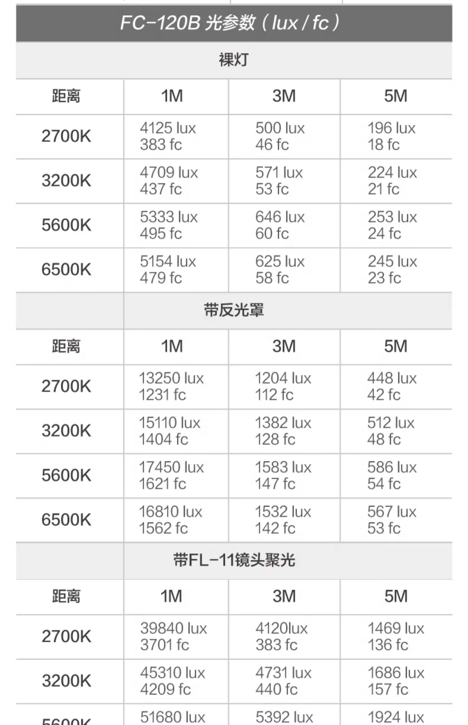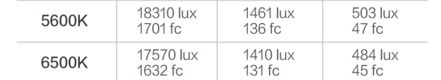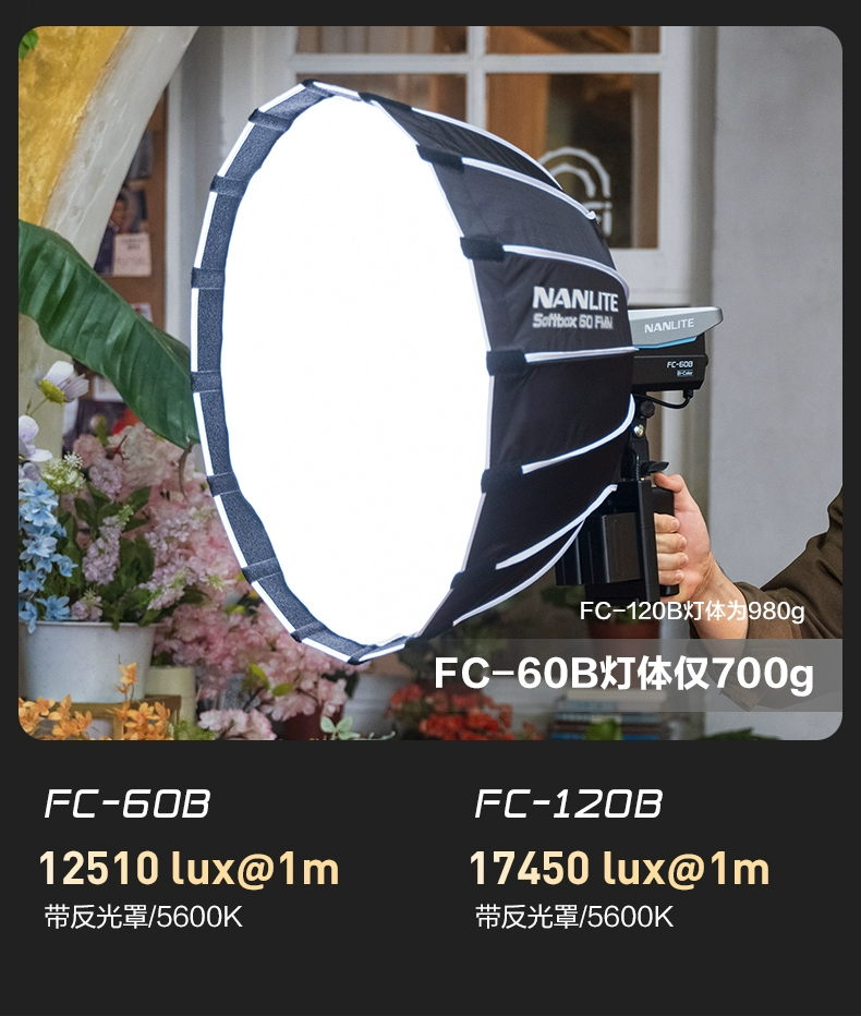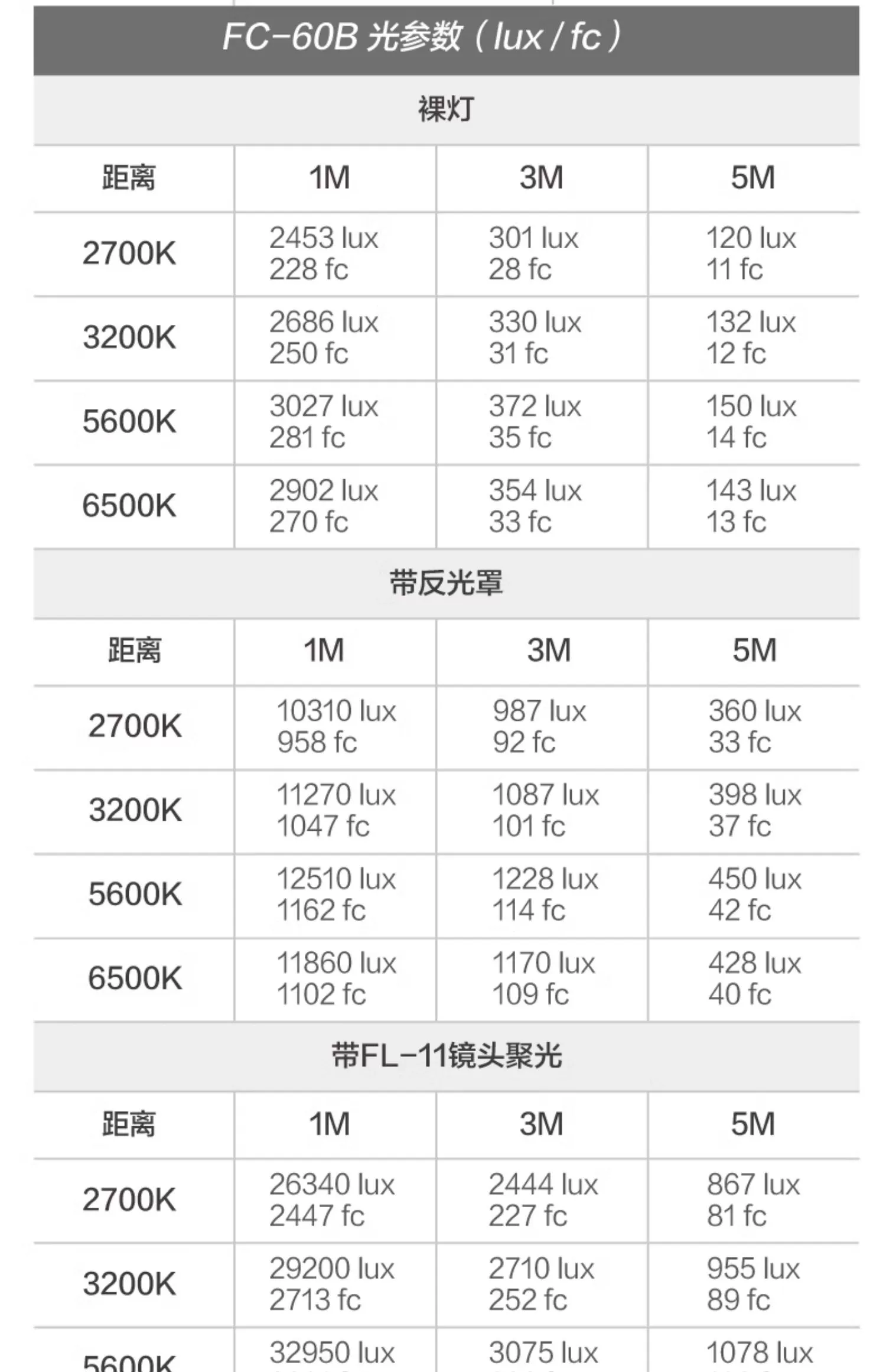 FC60B 提供 2700K 至 6500K 的可調色溫範圍,讓使用者能夠根據需求調整光源色溫。此外,該燈具搭配迷你反光罩時,最大亮度可達 12,510 lux,滿足各種拍攝需求。